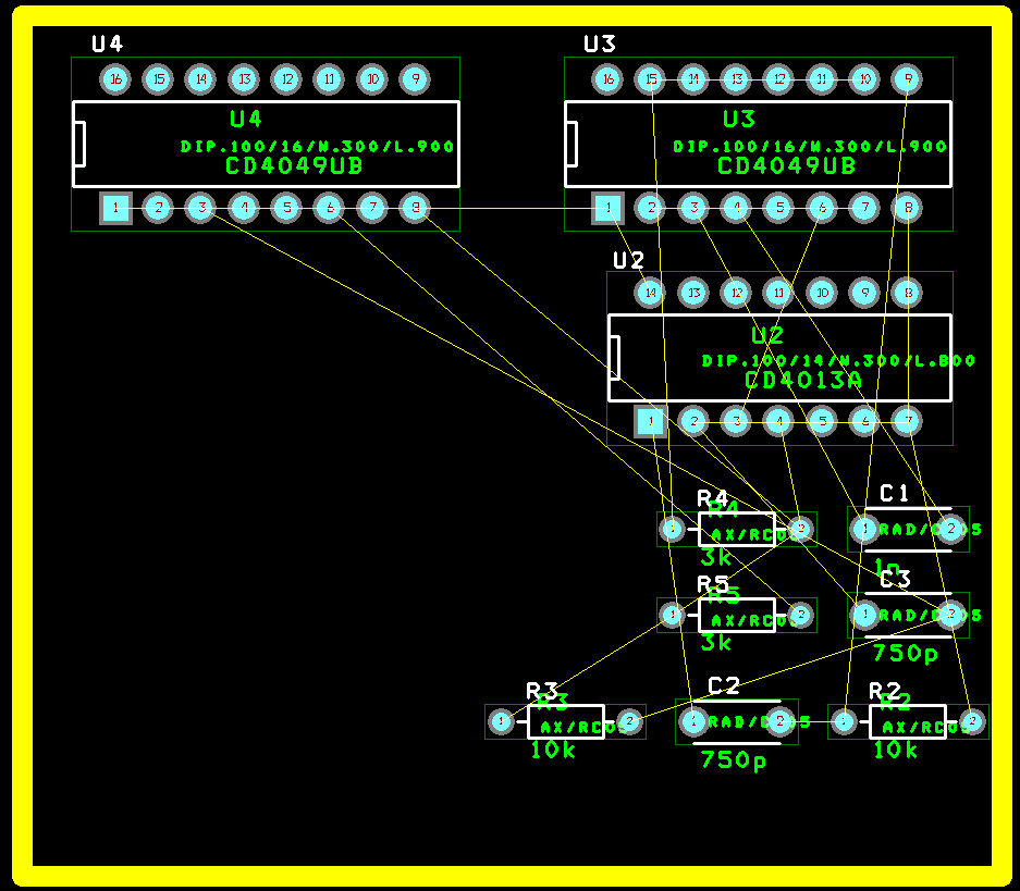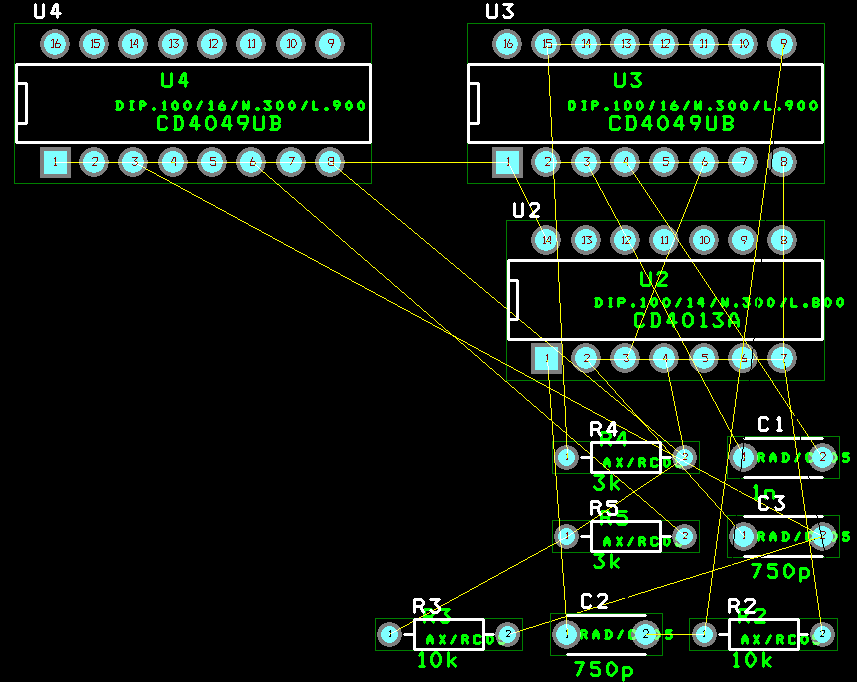 Вторая часть схемы, включающая в себя элементы R2C3 и DD3.1-DD3.3, работает по такому же принципу.