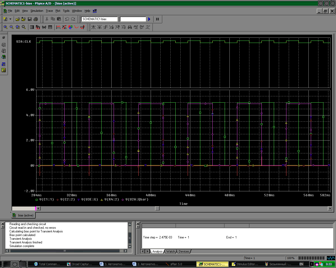 Рис. 5 – Окно PSpice A/D с отображенными диаграммами работы схемы.