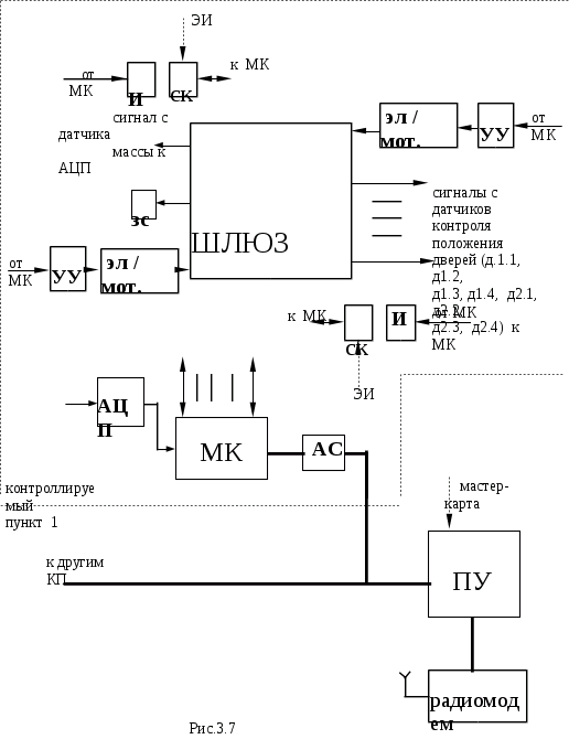 Теперь покажем, что из себя представляет контролируемый пункт объекта защиты. Конструктивно контролируемый пункт представляет из себя шлюзовую систему, с двумя сдвижными дверями (показать плакат). Каждой сдвижной дверью управляет электромотор блокировки дверей. При подаче управляющего напряжения от устройства управления (показывать чертеж) на электромотор двери соответственно открываются или закрываются. В закрытом положении двери блокированы. Внутри шлюза установлен датчик массы, служащий для подтверждения подлиности пользователя.