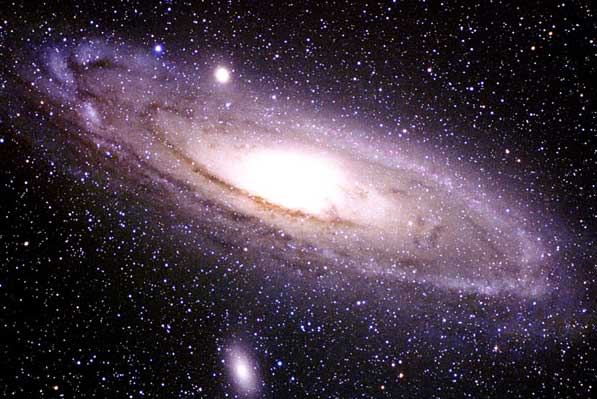 Галактика Андромеда — один из самых близких наших галактических соседей. В промежутке в 2,3 миллиона лет — один из самых далеких объектов, видимых невооруженным взглядом. Андромеда содержит 300 миллиарда солнц и охватывает 130,000 световых лет, что почти вдвое массивней нашей собственной галактики. Галактика — превосходный пример спиральной и предполагается, что наша собственная галактика имеет очень похожую структуру. Андромеда имеет две большие галактики — M32 и M110, которые видны на Рис. 5.
