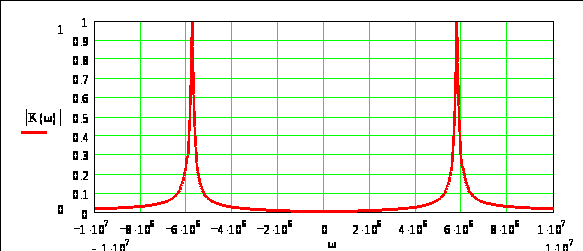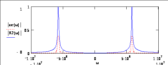 Сигнал на выходе должен мало отличаться по форме и по амплитуде от входного. Это связано с тем, что колебательное звено, являющееся широкополосным резонансным фильтром, имеет на резонансной частоте коэффициент передачи равный единице. Для большей наглядности изобразим Fr(j) и K2(j) на одном графике: