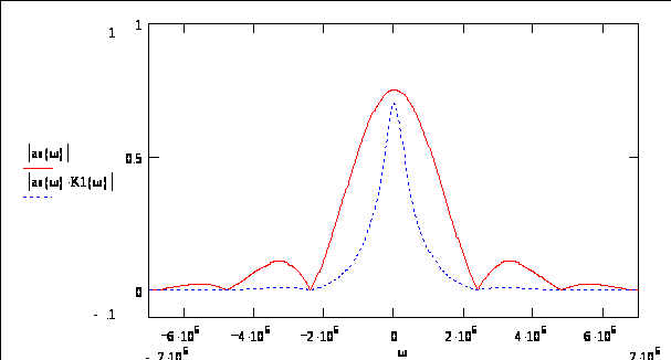 Объясняется это тем, что в диапазоне частот видеосигнала данная цепь имеет слабо неравномерный коэффициент пропускания, при этом большая часть гармоник сигнала (низкочастотных) проходит без изменений, а некоторая часть - ослабляется. Для большей наглядности изобразим F(j) и K1(j) на одном графике (рисунок 5.2):