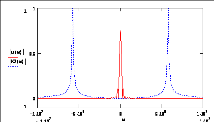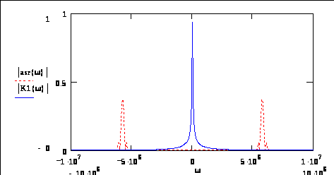 На выходе видеосигнал подавлен, так как на частотах видеосигнала колебательное звено имеет коэффициент пропускания равный нулю. Для большей наглядности изобразим F(j) и K2(j) на одном графике: