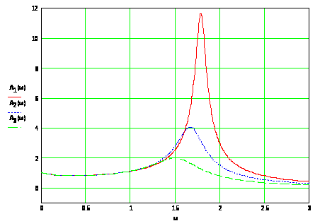 1. Вначале определим выражения для АЧХ замкнутой системы и построим их графики. Из графиков видно, что по мере приближения значения коэффициента передачи к критическому значению резонансный пик становится все более ярко выраженным (более высоким и узким). Первый случай (тонкая линия) резонансный пик наблюдается на частоте ω1 =1,78 с-1, второй случай (пунктир) - на частоте ω2 =1,65 с-1, а в третьем случае- на частоте ω2 =1,46 с-1. в третьем случае колебания отсутствуют. Основная полоса пропускания системы ограничена сверху частотой 1,1 с-1. Скрипт документа частотного анализа системы приведен ниже.