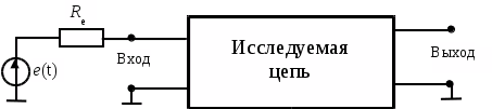 Для этого на вход заданной цепи (вариант схемы цепи определяется преподавателем), как показано на рис. 1.1, подключить реальный источник гармонического напряжения с э.д.с. e(t) = E>m>cos (ωt), амплитуда, частота ω и внутреннее сопротивление R>e> которого также определяются в соответствии с вариантом.