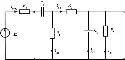 Расчет в данной схеме целесообразно начать с простого соединения двух элементов R>3 >и C>2>. Комплексное сопротивление этого участка цепи как любого параллельного соединения (см. формулу (2.19)) равно