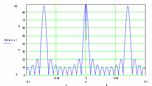 Как и ожидалось, главный максимум расположен в центре, т.е. при частоте =0.