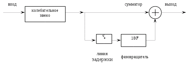С выхода колебательного звена сигнал подаётся на сумматор и на звено линии задержки сигнала на Ti (в нашем случае Ti =15 мкс), а с выхода звена задержки сигнал подаётся на фазовращатель (он нужен для того чтобы после окончания импульса отсутствовал радиосигнал на выходе сумматора).