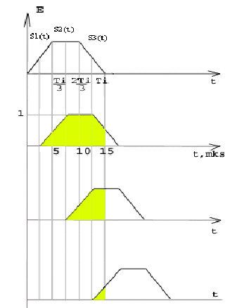 В нашем случае сигнал представляет собой прямоугольную пачку трапецеидальных (длительность вершины равна одной третьей длительности основания) радиоимпульсов (см. рис 1) в которой число импульсов N=9, а длительность импульса T>i>=15 мкс.