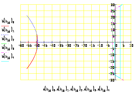 Данный характеристический полином позволяет выявить влияние kму на устойчивость системы. В частности, можно определить чувствительность изменения устойчивости системы от его величины и определить его критическое значение, т.е. построить область устойчивости системы при изменении этого коэффициента в заданной области. Для этого выделим вещественную и мнимые части вектора polyroots (a>i>(k>эму>) корней характеристического уравнения, т.е. представим их в виде: s>i> = a>i> + j·β>i>