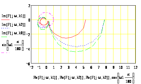 Убедимся, что это действительно так. Для этого построим кривые годографа Найквиста для трех значений коэффициента передачи магнитного усилителя: k>му> = 0.6 k>мукр>; k>му> = k>мукр>; k>му> =1.2 k>мукр>