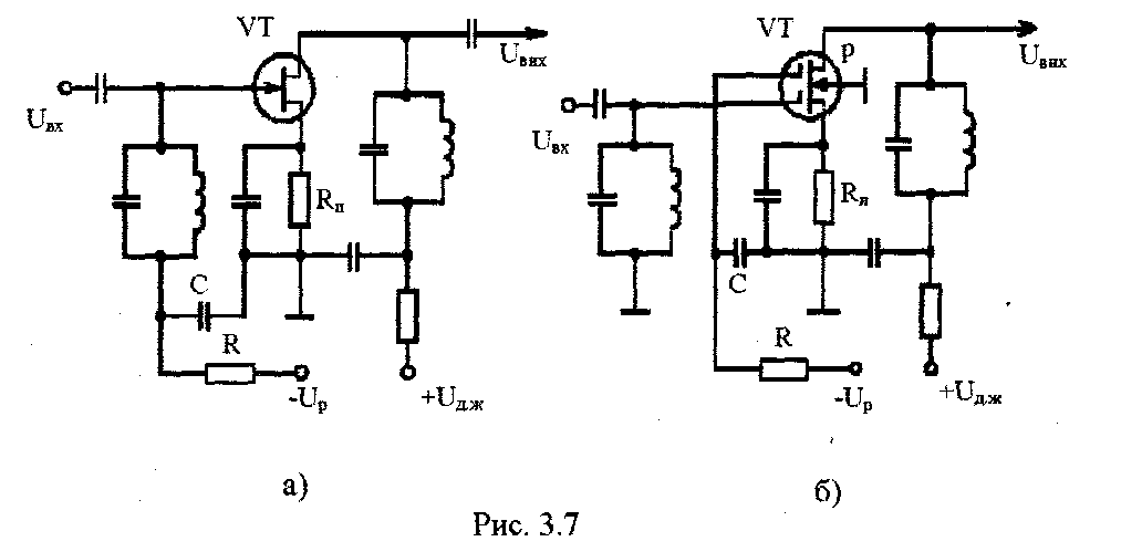 Принципові схеми введення напруги U>Р> стосовно до польових транзисторів приведені на рис. 7. У схемі рис. 7, а регулююча напруга вводиться в ланцюг затвора через СR - фільтр, що володіє малою постійної часу і призначений тільки для фільтрації складових несущої частоти сигналу. Напруга U>Р> має негативний знак, тому що використовується транзистор з n-каналом, а збільшення U>р> повинне приводити до зниження крутизни.