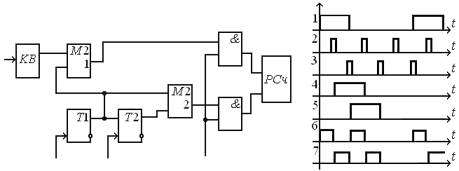 Рис.14. Схема и временные диаграммы функционирования дискриминатора для системы тактовой синхронизации.