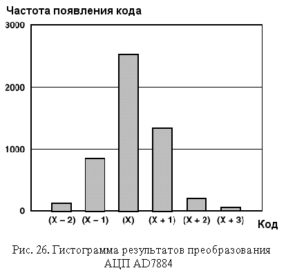 Входное напряжение из диапазона + 5 В было установлено по возможности ближе к центру кода. Как видно из гистограммы, все результаты преобразований распределены на шесть кодов. Среднеквадратическое значение шума, соответствующее этой гистограмме, равно 120 мкВ.
