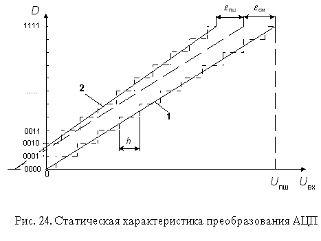 Такую зависимость по аналогии с ЦАП называют обычно характеристикой преобразования АЦП. В отсутствие аппаратных погрешностей средние точки ступенек расположены на идеальной прямой 1 (рис. 19), которой соответствует идеальная характеристика преобразования. Реальная характеристика преобразования может существенно отличаться от идеальной размерами и формой ступенек, а также расположением на плоскости координат. Для количественного описания этих различий существует целый ряд параметров.