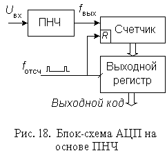 Таким образом, по существу ПНЧ преобразует входное напряжение в унитарный код. Для его преобразования в двоичный позиционный можно использовать счетчик. Схема интегрирующего АЦП на базе ПНЧ приведена на рис. 18. Двоичный счетчик подсчитывает число импульсов, поступивших от ПНЧ за период Т>отсч>=1/f>отсч>, задаваемый отсчетными импульсами, которыми содержимое счетчика заносится в выходной регистр-защелку. Вслед за этим происходит обнуление счетчика. Число импульсов n, подсчитанных счетчиком за время Т>отсч>,