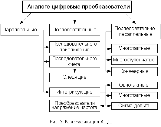 В основу классификации АЦП положен признак, указывающий на то, как во времени разворачивается процесс преобразования аналоговой величины в цифровую. В основе преобразования выборочных значений сигнала в цифровые эквиваленты лежат операции квантования и кодирования. Они могут осуществляться с помощью либо последовательной, либо параллельной, либо последовательно-параллельной процедур приближения цифрового эквивалента к преобразуемой величине.