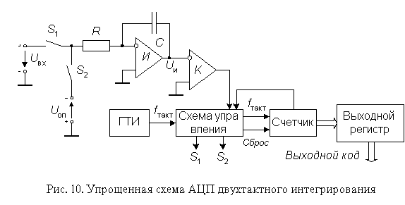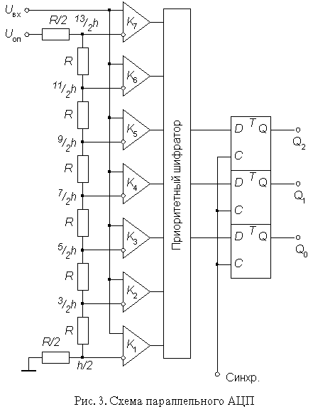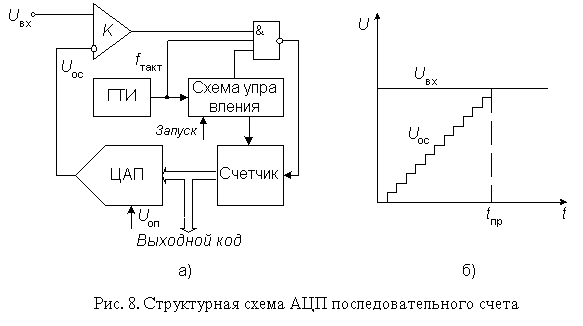 Рассмотрим пример 8-разрядного последовательно-параллельного АЦП, относящегося к типу многотактных (рис. 5). Здесь процесс преобразования разделен во времени.