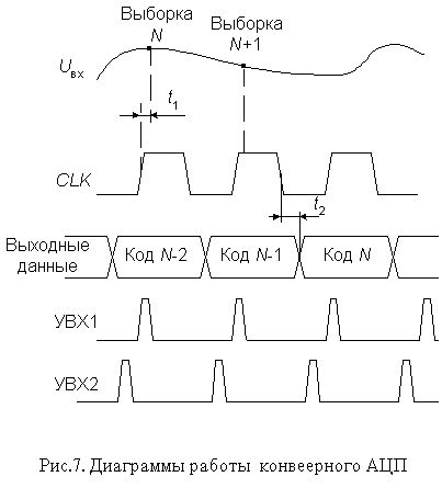 Время преобразования (t>пр>) - это время, отсчитываемое от начала импульса дискретизации или начала преобразования до появления на выходе устойчивого кода, соответствующего данной выборке. Для одних АЦП, например, последовательного счета или многотактного интегрирования, эта величина является переменной, зависящей от значения входного сигнала, для других, таких как параллельные или последовательно-параллельные АЦП, а также АЦП последовательного приближения, примерно постоянной. При работе АЦП без УВХ время преобразования является апертурным временем.