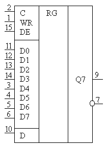 Для этой цели используется восьмиразрядный сдвиговый регистр К555ИР9 (DD6). Этот регистр позволяет записывать параллельный восьмиразрядный код. Преобразование параллельного кода в последовательный происходит за восемь тактов подаваемых на синхронизирующий вход С. На первом такте подаваемом на вход С параллельный восьмиразрядный код записывается как Q>0>Q>7> (Q>i> – состояние выхода i-го разряда), для этого подаем низкий потенциал на вход WR переключая тем самым регистр в режим записи. На первом такте значение Q>7> передается на выход. На втором такте подаваемом на С параллельный код Q>0>Q>7> сдвигается на один разряд Q>0>Q>1>, Q>1>Q>2>, …, Q>6>Q>7>. Последовательный вход D заземляем, поэтому в первый разряд записывается нуль (Q>0> = 0). На выходе появляется следующий импульс. За восемь тактов весь код выходит из регистра последовательно. Вывод DE не используем и тоже заземляем.