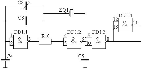 Генератор тактовых импульсов строится на микросхеме К155ЛА3 и кварцевом резонаторе ZQ1.