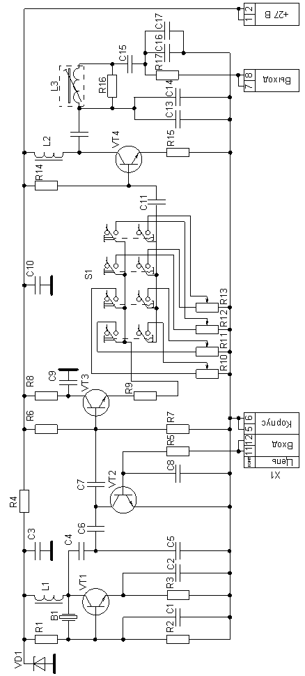 Усилитель (транзистор VT4) имеет на выходе четырехполюсник (конденсаторы 13 — 17 и катушка индуктивности 3), согласующий выходное сопротивление транзистора VT4 со входным сопротивлением выходного усилителя.