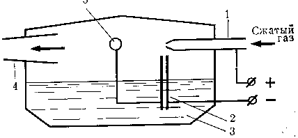Для придания частицам аэрозоля заряда и получения электроаэрозоля на воздушное сопло и на соединенную с сепаратором, опущенную в жидкость трубку подается постоянное напряжение. За счет электростатической индукции на поверхности жидкости, вытекающей из трубки, наводятся заряды. Эти заряды остаются на возникающих при распылениях капельках - образуется электроаэрозоль, который выходит из распылителя по патрубку 4.