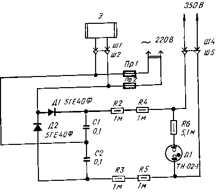 На жидкостное и газовое сопла с помощью шнура 3 от выпрямителя подается постоянное напряжение 350 В (см. рис. 6). Выпрямитель питается от сети переменного тока по бестрансформаторной схеме. Выпрямитель собран по схеме удвоения на диодах Д1, Д2 и конденсаторах С1, С2. В цепи выпрямленного напряжения включена цепочка резисторов R1-R4, обеспечивающих безопасность при случайном касании жидкостного или газового сопла. Индикатором наличия напряжения на электродах является неоновая лампа Л1, включенная последовательно с резистором R6. При случайных межэлектродных замыканиях напряжение на выходе выпрямителя падает и лампа гаснет.