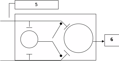 Рисунок 3 - Модель «воротного» контроля боли: 1 - волокна большого диаметра, 2 - волокна малого диаметра, 3 - желатинозная субстанция,4 - Т-клетки, 5 - система центрального контроля, б - система действия
