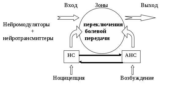 Экспериментальные и клинические работы последних лет показали, что болевые ощущения у человека обусловлены изменением динамического соотношения между уровнями НМ и НТ. АНС и НС в процессе продукции НМ и НТ оказываются взаимосвязанными т. к. активация одной из систем приводит не только к усилению ее функционирования, но и вызывает торможение другой системы.