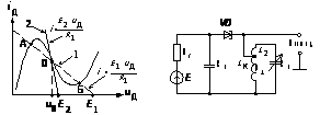 В первом случае, при крутизне наклона характеристики |S(U>0>)| > 1/R >i>, существует три возможных состояния, удовлетворяющих уравнениям системы – точки А, О, Б. Анализ, с учетом емкости самого диода, показывает, что только точки А и Б, расположенные на нарастающих участках характеристики, являются устойчивыми. Если точка покоя (точка О) находится на участке характеристики с отрицательным наклоном, то состояние схемы будет неустойчивым и рабочая точка самопроизвольно смещается в одно из крайних положений (в точку А или точку Б).