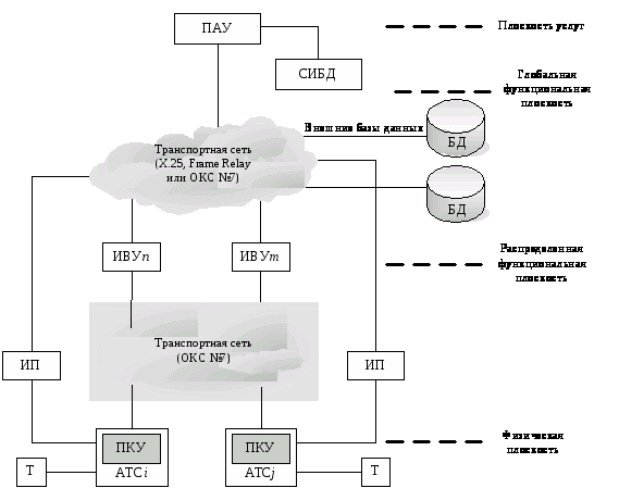 Физическая плоскость представляет физические элементы (Physical Entities, РЕ) сети, в которой реализована концепция IN. Этими РЕ могут быть коммутационные станции, выполняющие функции пунктов коммутации услуг – ПКУ (Service Switching Point, SSP). Пункт коммутации услуги распознает запросы на предоставление ДВО по коду (префиксу), набираемому пользователем, и формирует заявки к ИВУ. Средства ПКУ являются ведомыми по отношению к ИВУ. Команды, поступающие от ИВУ, определяют последовательность обработки запроса на предоставление услуги.