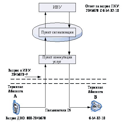 Услуга UPN подобна той, которой пользуются абоненты сетей подвижной связи. Абонент, желающий получить услугу UPN, регистрируется в IN и получает логический номер, по которому его можно отыскать независимо от того, где он находится. Для этого он, переезжая в другой населенный пункт страны или мира, сообщает IN номер (или номера) телефона, куда нужно переадресовать все входящие вызовы. Услуга FPH, относящаяся к «службе 800», обеспечивает установление местных и междугородных соединений с поставщиками информации (например, рекламными фирмами) и передачу информации за их счет. Услуги, относящиеся к ДВО, реализуются только по специальному запросу пользователя. Разные группы пользователей могут получать разные наборы ДВО. Элементом концепции IN является отделение функций управления основными услугами от управления ДВО.