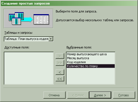 Затем выбираем таблицу "Список выпускаемых изделий" и перемещаем в список выбранных поле "Наименование изделия".