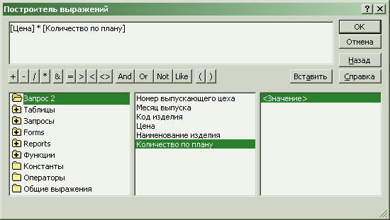 Для создания второго запроса используем конструктор запросов, создавая новое поле "Стоимость по плану: [Цена] * [Количество по плану] " с помощью построителя выражений (рис.3.10).