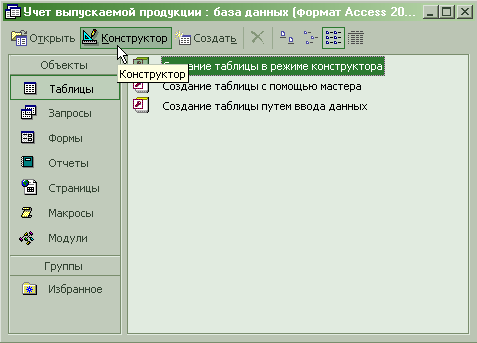 Запускаем Microsoft Access. Для создания таблиц указанной структуры используем команду "Конструктор" на панели инструментов базы данных (3.1).