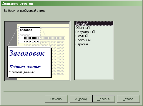 На втором шаге отказываемся от группировки, на третьем отказываемся от сортировки содержимого запроса, на четвертом выбираем макет "блок", на пятом - стиль "Деловой" (рис.3.12), на последнем вводим имя отчета "Выпускаемые изделия" и завершаем создание отчета.