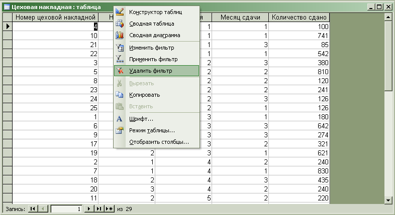 Чтобы применить заданные условия отбора, выполняют команду "Применить фильтр". Соответствующая кнопка при этом как бы "залипает". Повторное выполнение этой команды отображает все записи таблицы. Применение фильтра для данных формы или таблицы позволяет отобразить только те записи, которые удовлетворяют определенному условию отбора. Для создания фильтров используются следующие команды подменю Записи > Фильтр:
