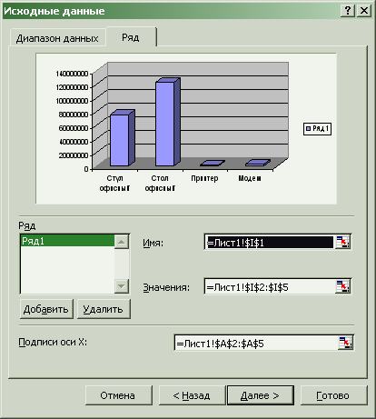 На втором шаге переходим на вкладку "Ряд" и в пункте "Имя" устанавливаем значение "=Лист1! $I$1" (имя ряда), а в пункте "Подписи оси Х" - значение "=Лист1! $A$2: $A$5" (рис.2.9). Нажимаем кнопку "Далее".
