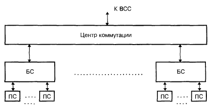 Рис. 1.3. Упрощенная функциональная схема системы сотовой связи: БС – базовая станция; ПС – подвижная станция (абонентский радиотелефонный аппарат).