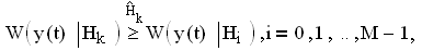 Таким образом, оптимальный различитель М сигналов равной энергии со случайными начальными фазами должен вычислить все М величин Z>i> и, если максимальной из них является Z>k>, принять решение о присутствии в y(t) k-го сигнала. Это означает, что содержащимся в наблюдаемом колебании y(t) считается тот сигнал, комплексная огибающая которого имеет наибольшую по модулю корреляцию с комплексной огибающей y(t).