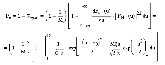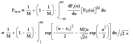 Первое слагаемое соответствует априорной вероятности правильного решения для M равновозможных событий. Второе слагаемое определяет изменения вероятности за счет принятия решения. При z>0>→∞ интеграл в выражении для P>прав> стремится к 1 и, соответственно, P>прав>→1.
