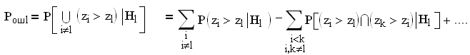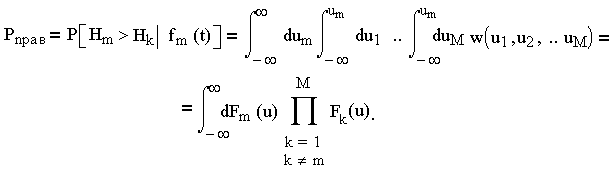 Рассмотрим методику расчета вероятности ошибки различения M сигналов с неизвестными параметрами при однолучевом распространении сигналов (или в схеме оптимального сложения сигналов). Обозначим через H>k>=sup L>k>(τ>k>) – величину абсолютного максимума статистики на выходе k-го канала приемника. Совместное распределение случайных величин {H>1>,H>2>,..H>M>} запишем как w(u>1>,u>2>,..u>M>). Условие ортогональности для сигналов f>k>(t) в статистическом смысле означает независимость случайных величин H>k>, k=1..M. Тогда вероятность правильного решения по алгоритму максимального правдоподобия можно записать