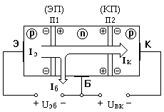 Как известно, при “дырочной" проводимости типа “p" основными носителями заряда являются “дырки”, а неосновными электроны. Часть “дырок” пришедших в базовую область рекомбинируют в электроны, появляется ток базы (Iб), который очень мал по сравнению стоком эмиттера, так как только малая часть инжектированных “дырок” (носителей заряда) рекомбинирует.