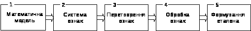 В даній роботі увага приділена особливостям розпізнавання симетричних об'єктів за моментними ознаками з формуванням еталонів об'єктів [6-9]. Сам процес формування результуючих сигналів класифікації вхідних зображень об'єктів передбачає такі етапи розпізнавання (рис. 1).