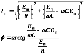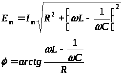 Полагая, в частности, ωt = π/2 и ωt = 0, получим RI>m> = U>m>cosφ; (ωL – 1/ωC)I>m> = U>m>sinφ.