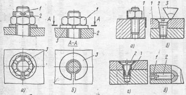Предохранение винтовых соединений от саморазвинчивания с помощью разводных шплинтов (рис. 5, а) осуществляется путем установки шплинта 2 в отверстия гайки 3 и винта (болта) 1 с последующим разведением концов шплинта относительно друг друга. Отверстия под шплинт 2 сверлят при сборке узла или прибора.