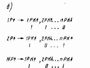 Схемная реализация ШФК обычно очень проста. В релейно-контактных системах на входе каждого разряда регистра кода включается набор (схема ИЛИ) контактов тех реле регистра сообщений (1P—NP), которые будут включаться при записи единицы в данном разряде кода (рис. 9).