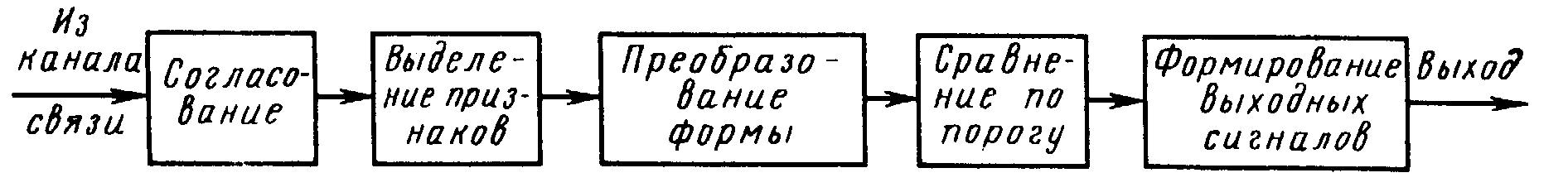 Вид демодулятора зависит от используемых импульсных признаков, однако, можно выделить следующие характерные функции (рис. 15): оптимальное согласование входа демодулятора с каналом связи; выделение импульсных признаков в сигнале; преобразование параметров выделенных признаков в форму, удобную для последующего анализа и сравнения; сравнение по порогу или с «образцами» сигнала; формирование выходных сигналов демодулятора.