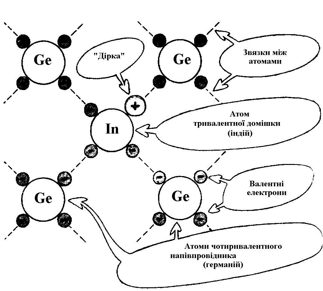 Домішкою для утворення в напівпровіднику p–області може бути алюміній, індій, бор та ін. Усі вони є акцепторами, оскільки їх атоми забирають електрон у сусідніх атомів.